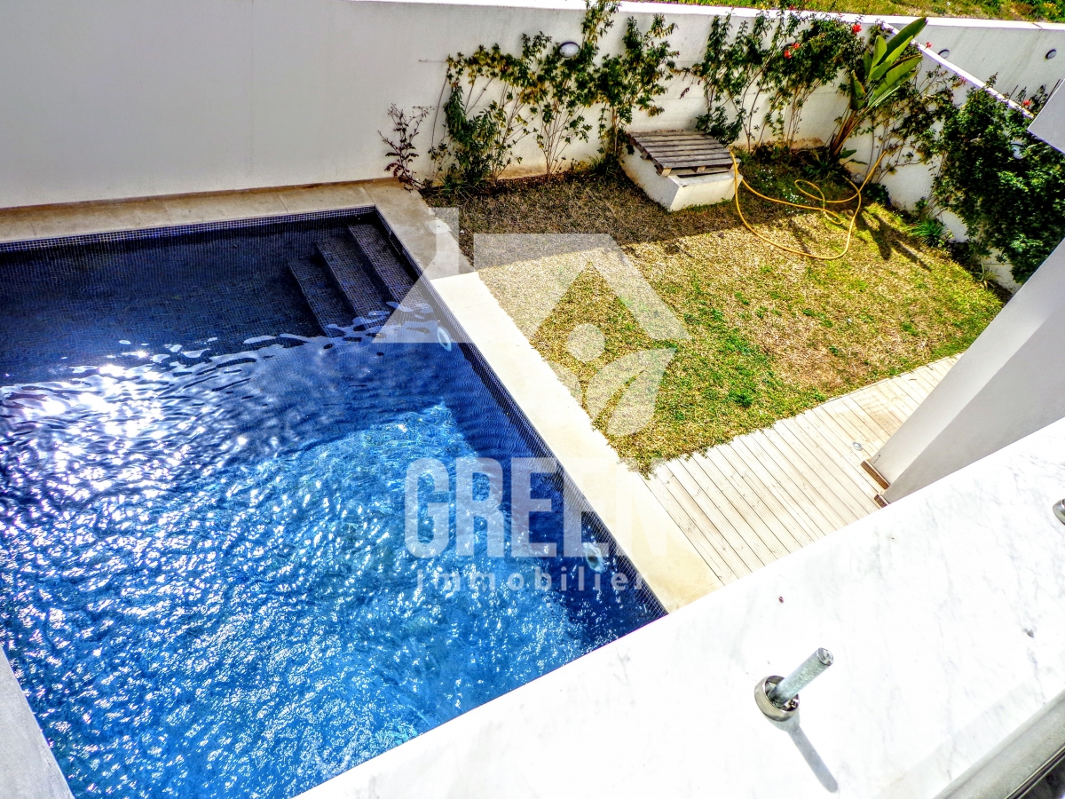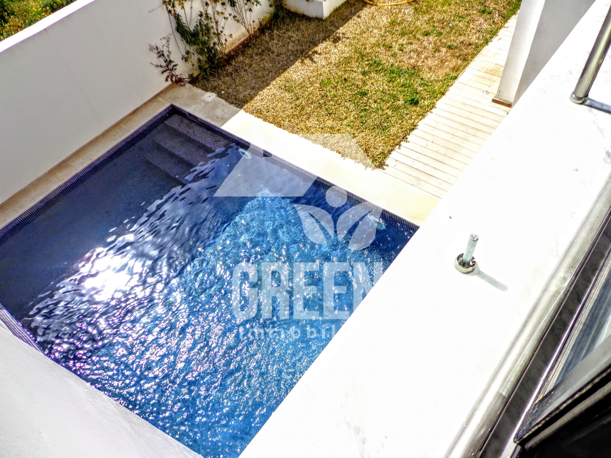 À vendre chez Green immobilière un beau duplex neuf et moderne de promoteur immobilier, dans une résidence sécurisée de haut standing, dans le célèbre quartier du théâtre d'Hammamet et à 5 min de la plage, des pâtisseries, des cafés et de toutes les commodités, le duplex mesure 202 m² plus 140 m² de jardin et offre: un salon, une salle à manger à double hauteur avec des fenêtres donnant sur le jardin et la piscine, une suite pour les parents avec dressing et salle de bains et balcon, deux chambres à coucher avec salle de bain commune, une cuisine ultra-moderne et très bien équipée et une salle d'eau Le duplex est équipée de climatisation et du chauffage central Des places de parking sont disponibles au sous-sol et sont au prix de 15 000 TND