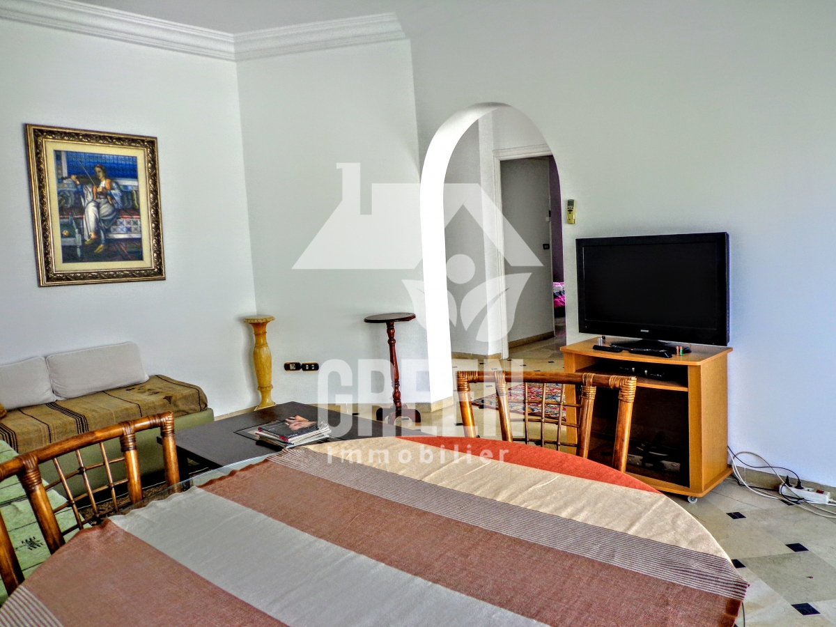 À louer a l'année chez Green immobilière un appartement meublé à Yasmine Hammamet du type S+2 d'une superficie de 120 m² dans un cartier luxueux et résidentiel à 2 minutes de la plage il se compose : -d'un spacieux salon et salle à manger -un grand terrasse -Deux chambres à coucher -une cuisine installée et bien aménagée -une salle de bain -un piscine L'appartement est équipé de climatisation. Le loyer est 1350 par Mois
