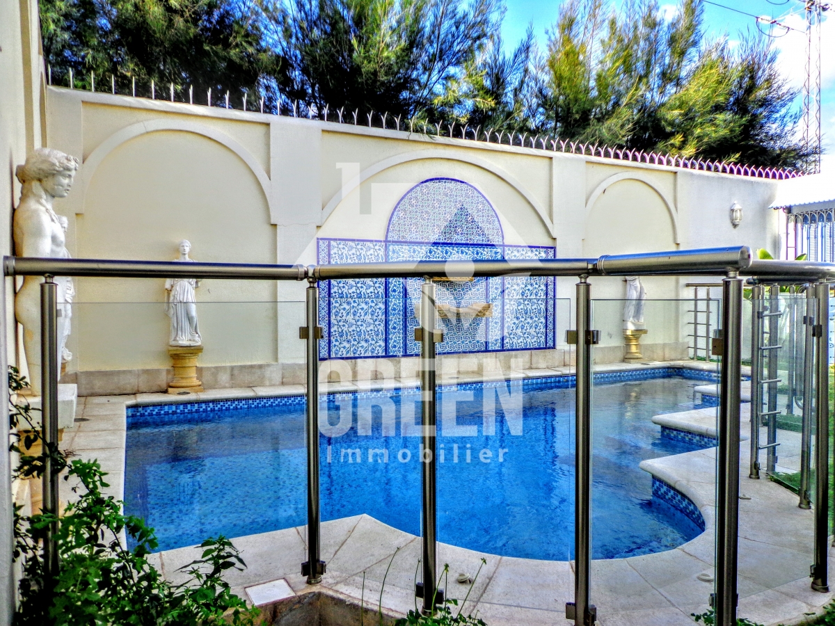 À vendre une demeure bien située à Yasmine Hammamet, dans un quartier calme et résidentiel Elle s’étend sur un terrain de 352 m² avec une superficie habitable de 720 m². Elle offre: -Quatre salons -Quatre cuisines bien aménagées -quatre suites parentales composées de :une chambre, une salle de bain, un dressing -un grand jardin -une piscine -un ascenseur La villa est équipée d'un chauffage central et de climatiseurs.